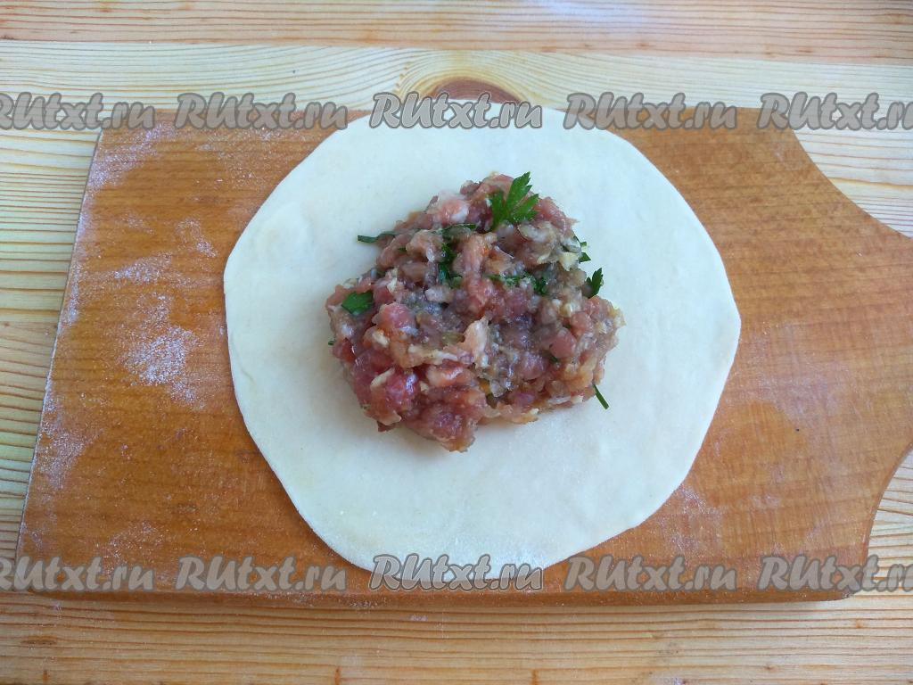 В центр каждой лепёшки разместить 1,5 чайные ложки мясного фарша.