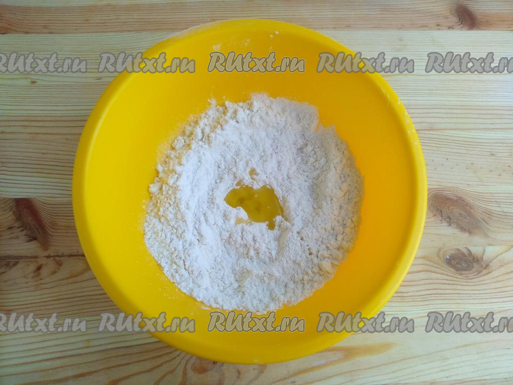 Сформировать по центру углубление, влить 1 столовую ложку растительного масла и 120 мл воды.
