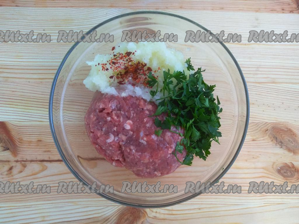 В отдельную миску выложить фарш, добавить мелко нарезанную петрушку, перекрученную через блендер луково-чесночную массу и дроблёный томат (по желанию), посолить, поперчить и тщательно перемешать фарш.