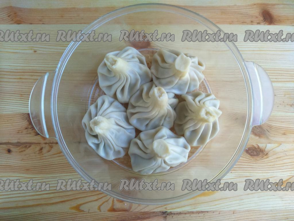 Чашу пароварки смазать растительным маслом, выложить заготовки хинкали, закрыть крышку пароварки и готовить 35-40 минут на пару.