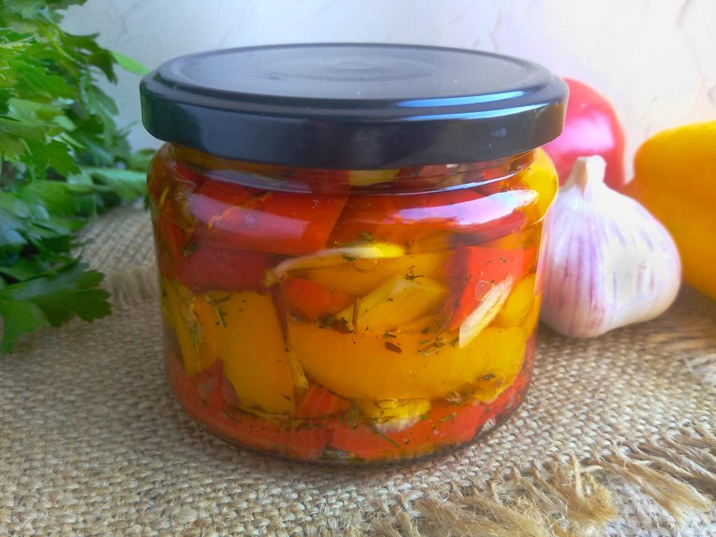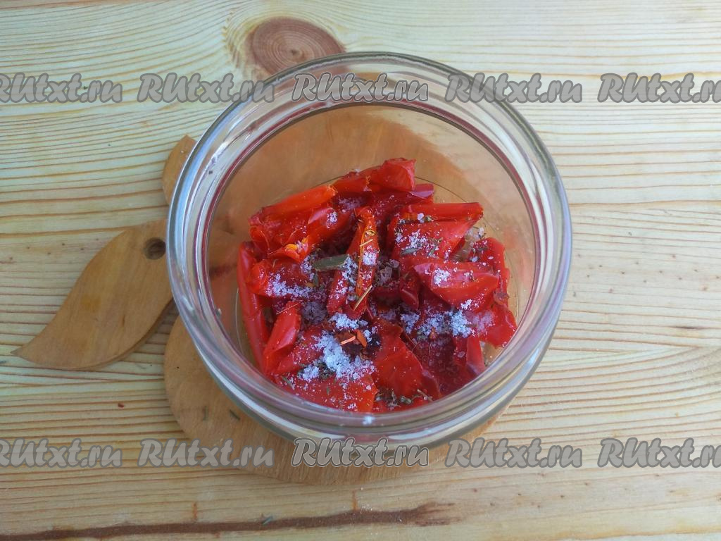 Вяленый болгарский перец - отличная заготовка на зиму, которая разнообразит ваше меню в холодное время года. Такой перец можно использовать для приготовления бутербродов и пиццы, а ароматное масло, в котором перец консервируется в банке, станет прекрасной заправкой для салата. Можно эту заготовку подать и к мясу или шашлыку. Вялить будем в духовке, что значительно ускоряет процесс. Для рецепта понадобится мясистый болгарский перец яркого цвета. Ароматные травы можно подобрать по вкусу. Рецепт дан на банку 350 мл.
