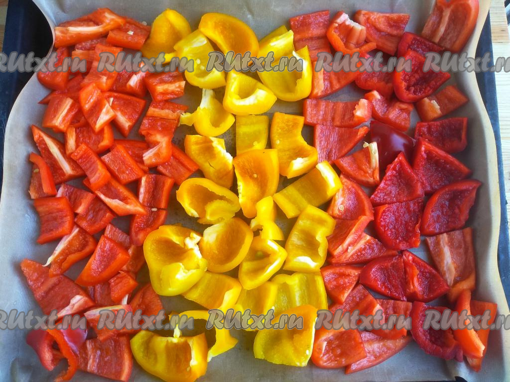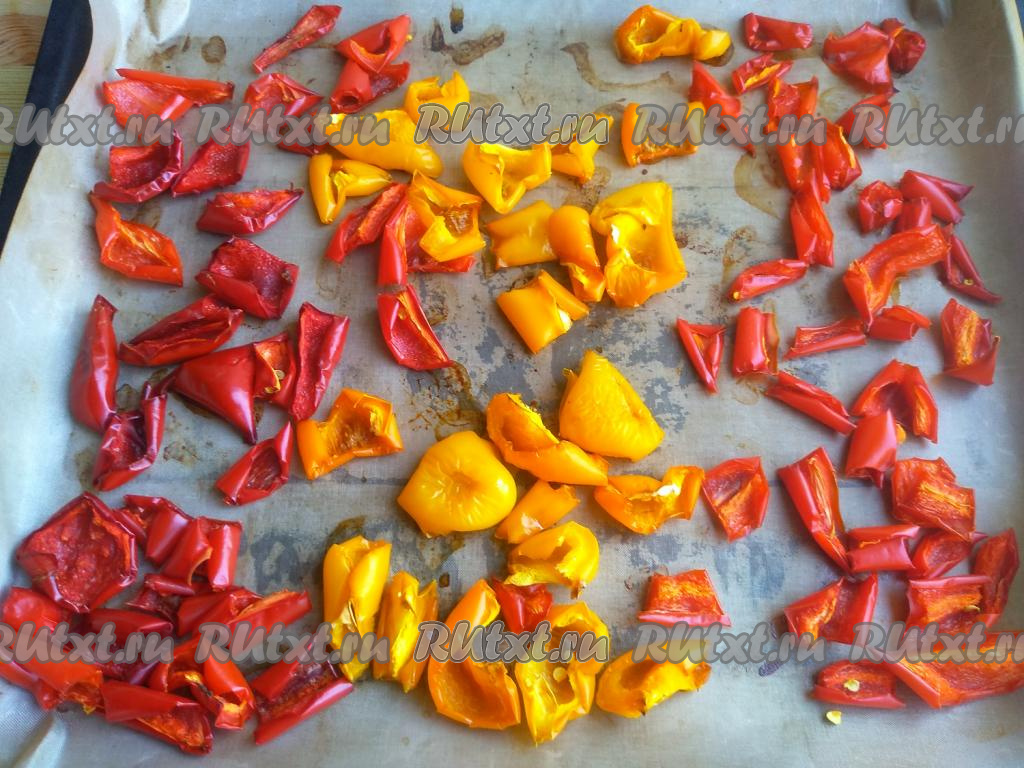 Выложить плотно подготовленные болгарские перцы на противень, застеленный пергаментной бумагой (или силиконовым ковриком), и поставить в разогретую до 100 градусов духовку. Вялить перцы при температуре 100 градусов в течение 2 часов при включённой конвекции. Если ваша духовка не поддерживает режим конвекции, можно слегка приоткрыть дверцу духовки.