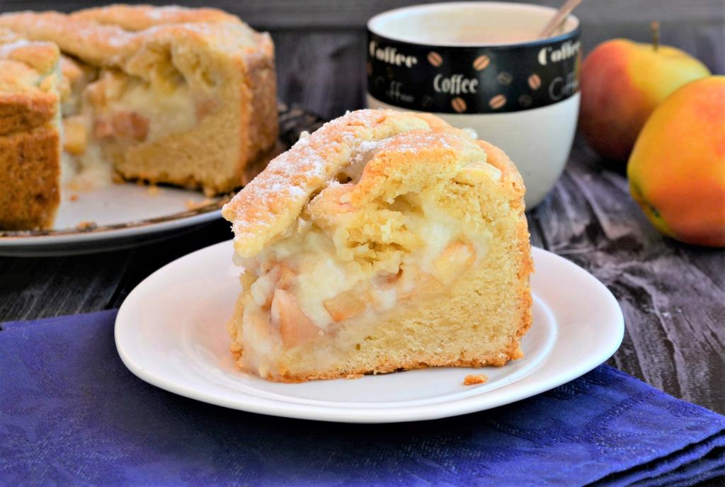 Невероятно вкусному и ароматному яблочному пирогу, приготовленному с заварным кремом, дать полностью остыть в форме, затем аккуратно извлечь его и разрезать на части острым ножом.