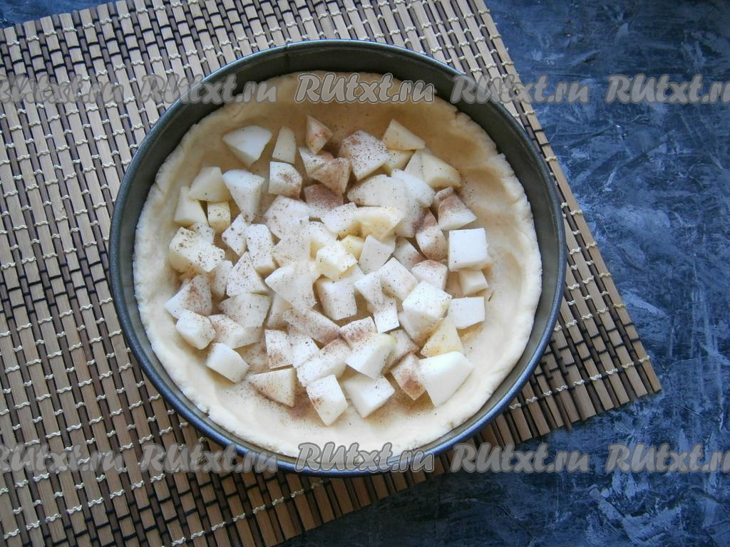 Тесто разделить на 2 части - одну большую, другую - меньшую. Большую часть теста раскатать и выложить на дно разъёмной формы диаметром 18-20 см, сформировав достаточно высокие бортики. Яблоки, очищенные от кожуры и семян, нарезать средними кубиками, выложить их в форму на тесто и посыпать молотой корицей.