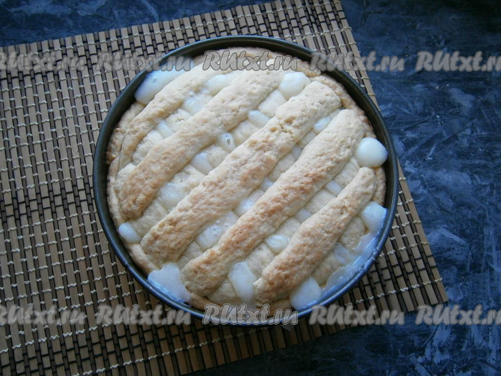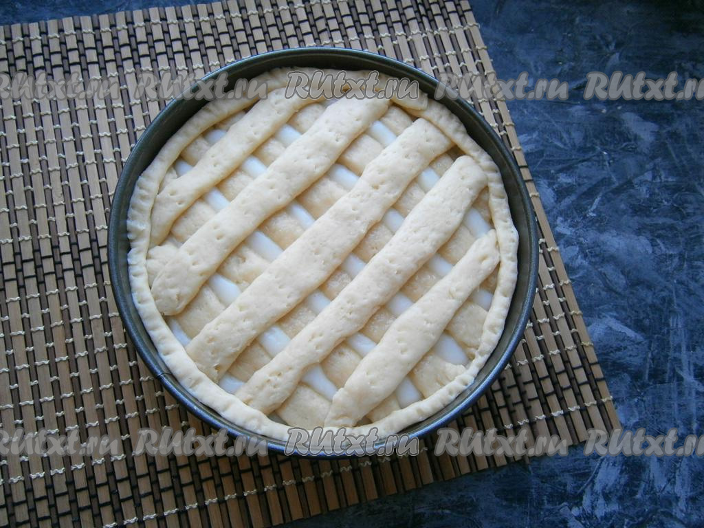 Из меньшей части теста сделать полосочки и закрыть ими крест-накрест весь пирог.
