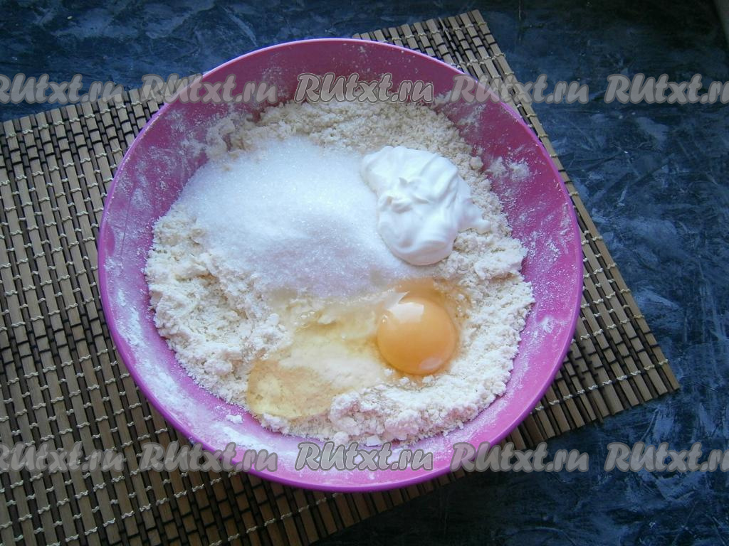 Перетереть муку с маслом руками в мелкую крошку, затем добавить сырое яйцо, 100 грамм сахара и сметану.