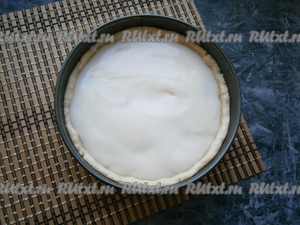 Тёплый заварной крем вылить поверх яблок (бортики должны быть достаточно высокими, крем не должен выходить за края этих бортиков).