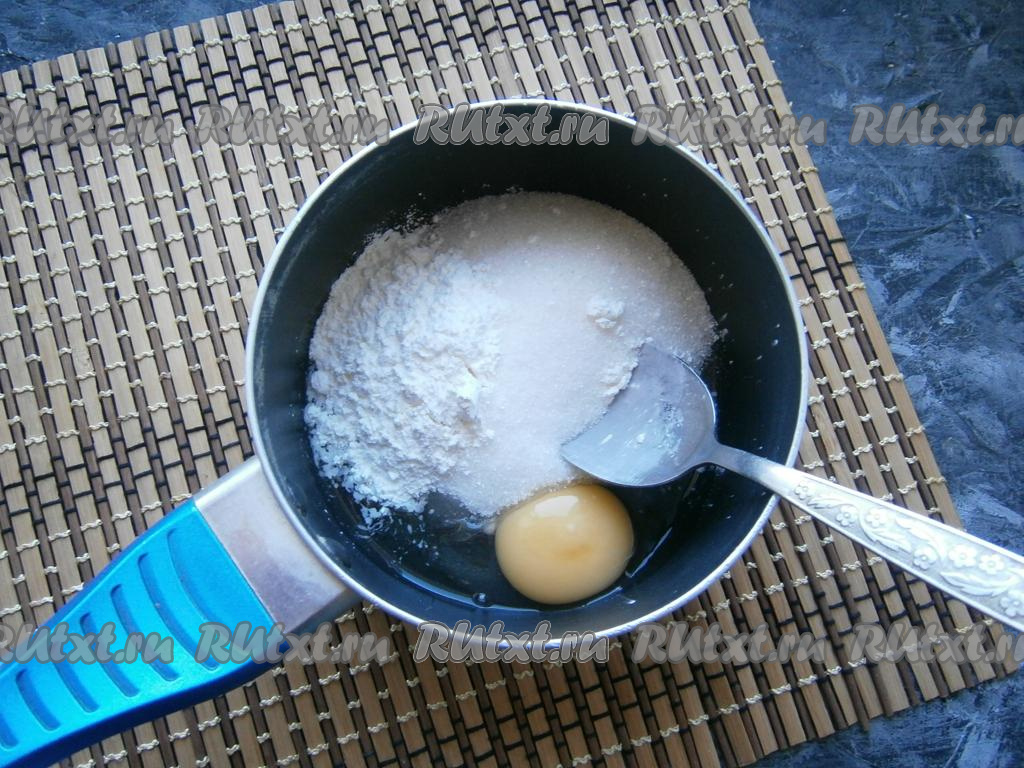 Для приготовления заварного крема нужно в ковшик (или кастрюльку) разбить яйцо, добавить сахар, крахмал и ванильный сахар.