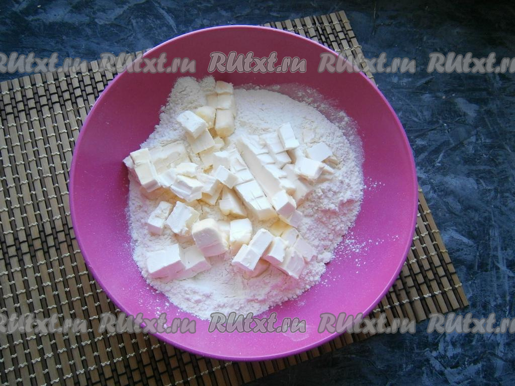 Для замешивания песочного теста муку смешать с щепоткой соли и разрыхлителем, добавить холодное сливочное масло (вместо масла можно взять маргарин), нарезанное кубиками.