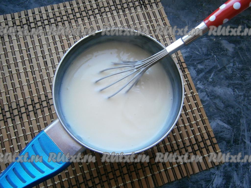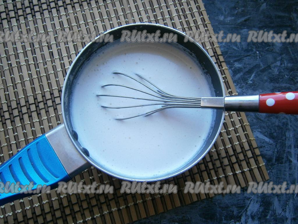 Получившуюся яично-крахмальную смесь перемешать венчиком до однородности, влить молоко комнатной температуры и ещё раз тщательно перемешать венчиком (до получения однородной смеси).