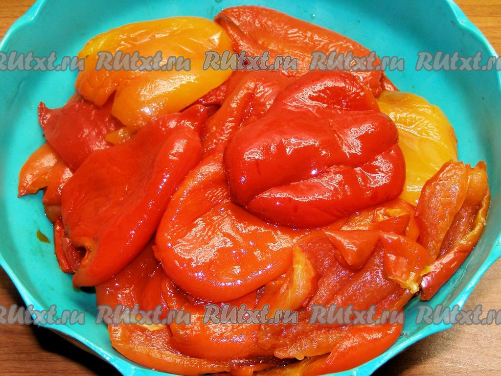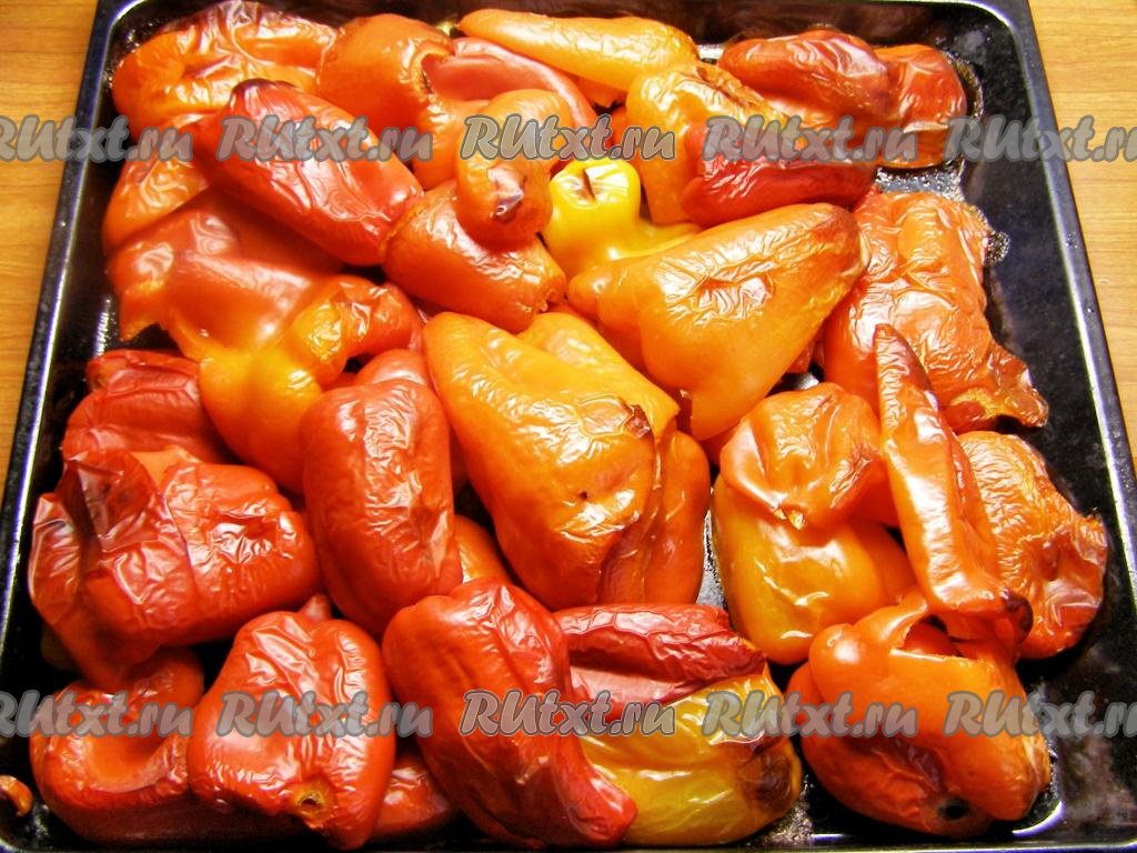 Выкладываем половинки перца на противень и запекаем в разогретой духовке при температуре 180-200 градусов, примерно, 15-20 минут (пока кожица не сморщится). Перекладываем перец в кастрюлю и оставляем немного остыть под закрытой крышкой - так с перца будет легче снять кожицу.