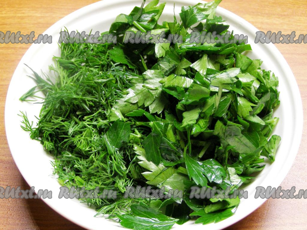 Свежую зелень (можно взять укроп, петрушку, базилик или кинзу - зелень выбираем по своему вкусу) измельчаем.