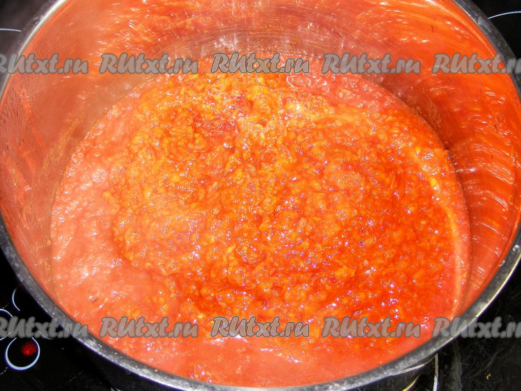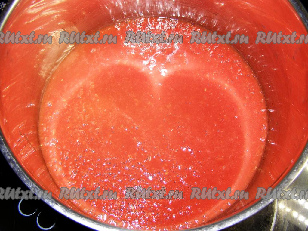 Перекручиваем помидоры через мясорубку и перекладываем в глубокую кастрюлю с толстым дном. Доводим до кипения на сильном огне, затем огонь уменьшаем и варим, периодически помешивая, пока масса слегка не загустеет (минут 15-20).