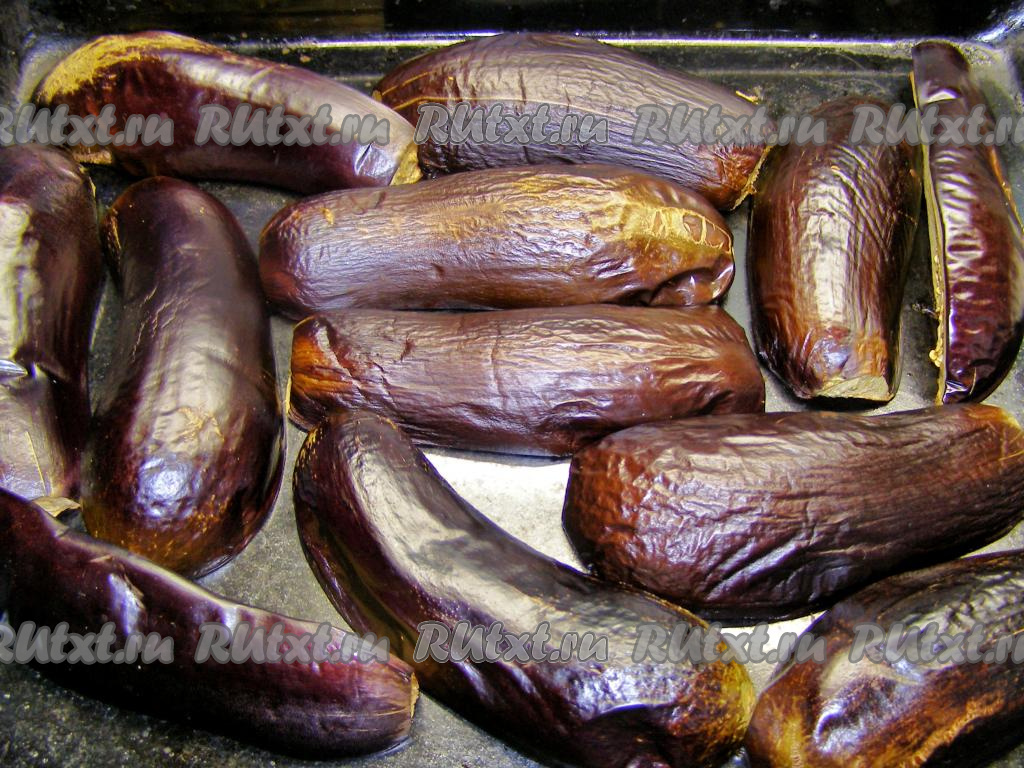 Выкладываем половинки баклажанов на противень и также запекаем в разогретой духовке при температуре 180-200 градусах около 20 минут (пока кожица не сморщится). Горячие баклажаны кладём в кастрюлю, накрываем крышкой (или в пакет и завязываем его) и оставляем немного остыть.