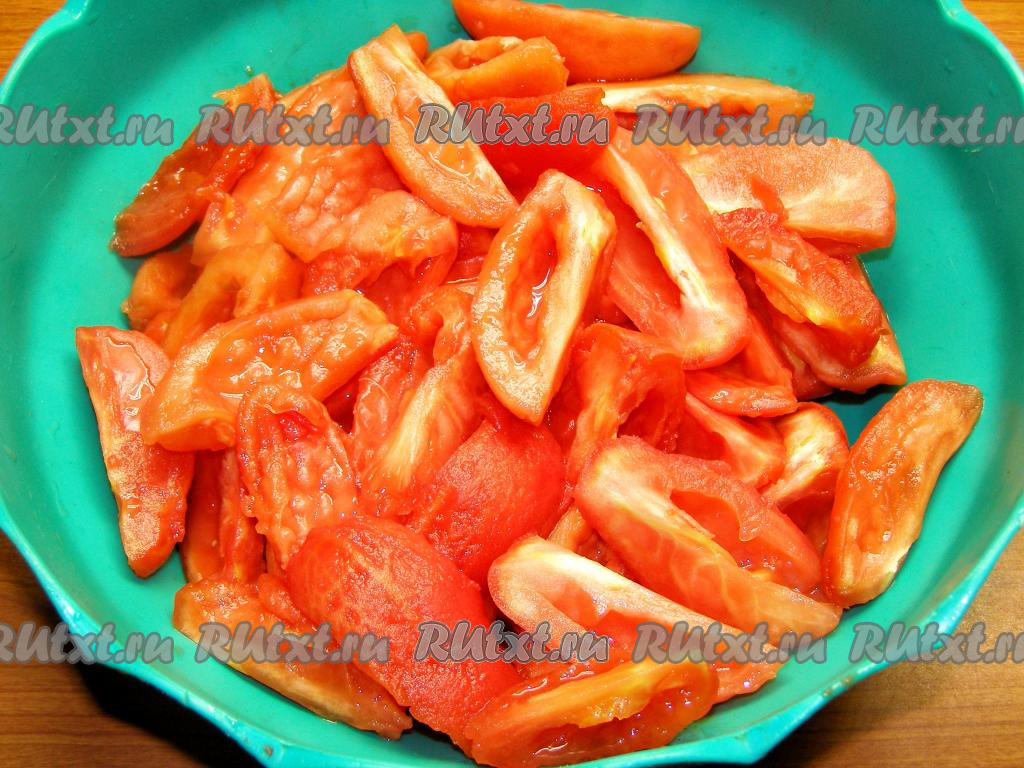 Снимаем с помидоров кожицу, затем разрезаем каждый помидорчик на 4 части и чайной ложкой удаляем семена.