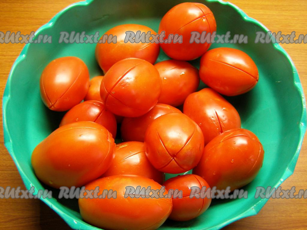 Помидоры хорошо моем и надрезаем кожицу каждого помидора крест на крест. Ошпариваем помидорчики кипятком, затем сразу опускаем в холодную воду.