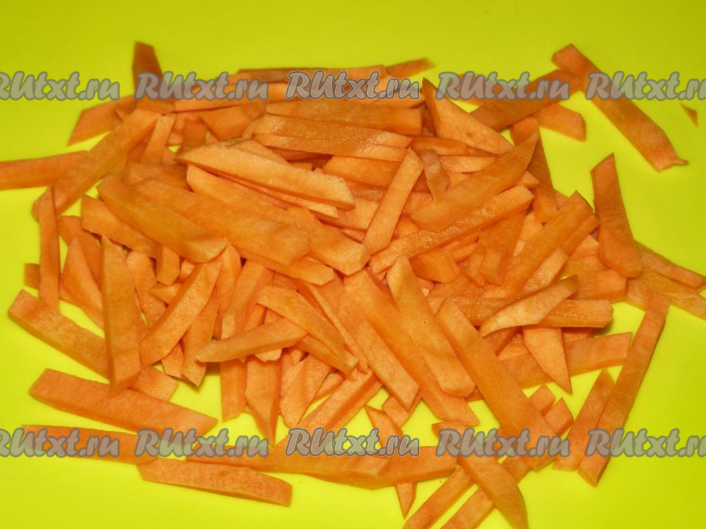 Моем, чистим морковку и нарезаем тонкой соломкой (можно натереть на тёрке для корейской моркови).
