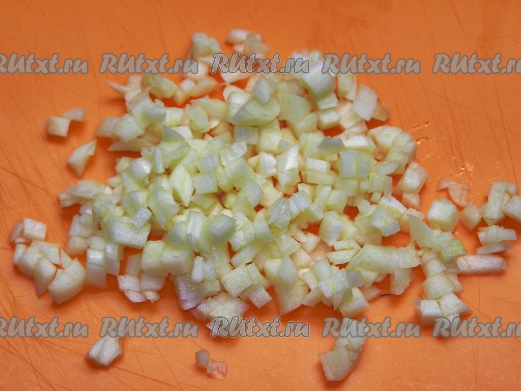 Очищаем чеснок от шелухи и нарезаем мелкими кубиками. Лучше не измельчать чеснок прессом, так как при жарке он может подгореть, что придаст блюду неприятную горечь.