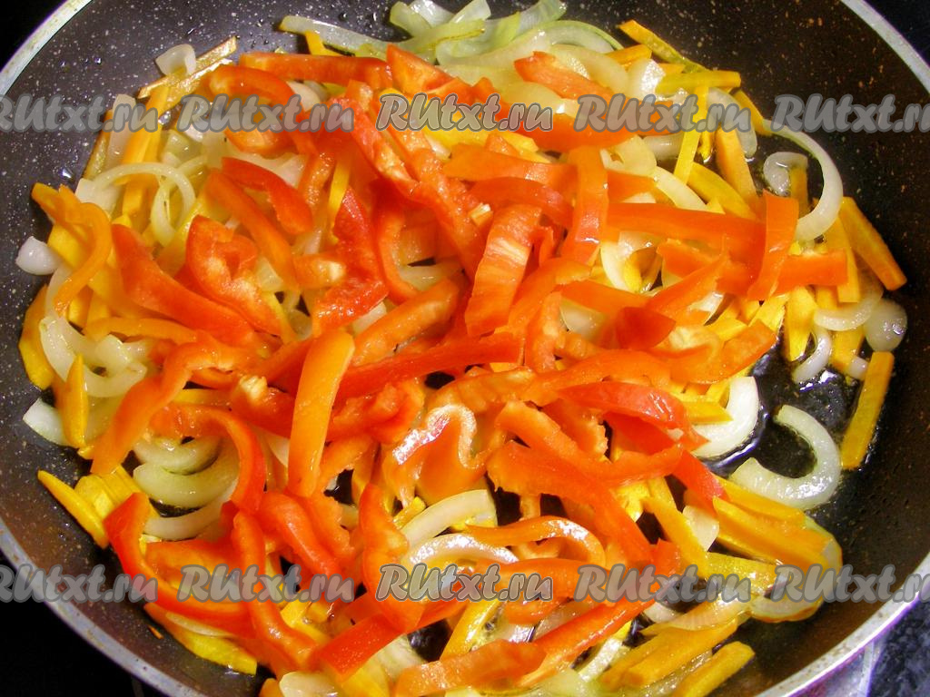 Добавляем болгарский перец и жарим ещё минуты 2, также периодически перемешивая, чтобы овощи не подгорали. Убираем сковородку с огня.