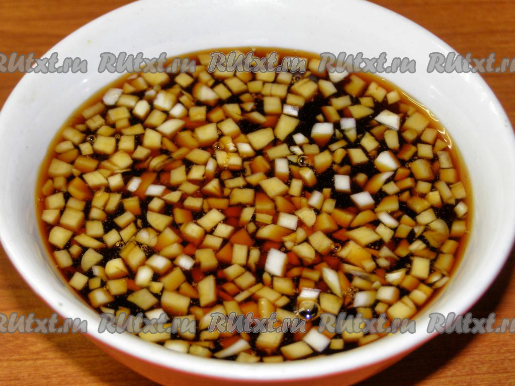 Для приготовления маринада смешиваем соевый соус, лимонный сок, мёд, добавляем чеснок. Лучше всего использовать жидкий мёд. Если мёд засахарился, растопите его на водяной бане.