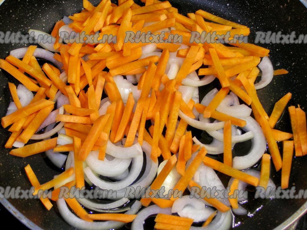 В сковородку наливаем 1 столовую ложку подсолнечного масла, выкладываем в него лук и морковь, обжариваем на среднем огне минуты 3, помешивая, пока овощи не станут мягкими.