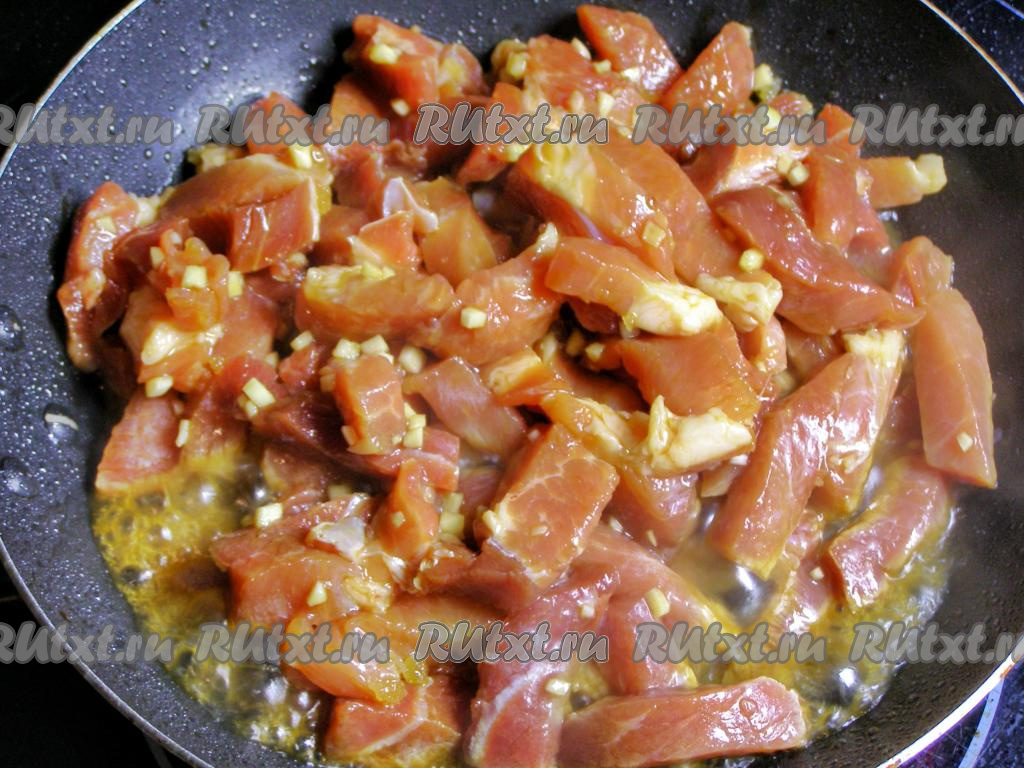 В другой сковороде разогреваем ещё одну столовую ложку подсолнечного масла и в горячее, почти раскалённое, масло осторожно выкладываем кусочки свинины. Маринад пока не добавляем. Обжариваем, постоянно перемешивая, на среднем огне, примерно, 5 минут. По желанию, можно немного поперчить.