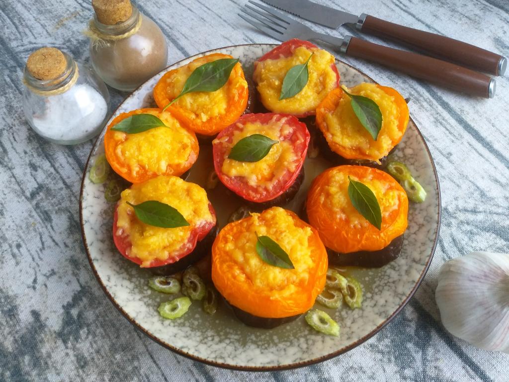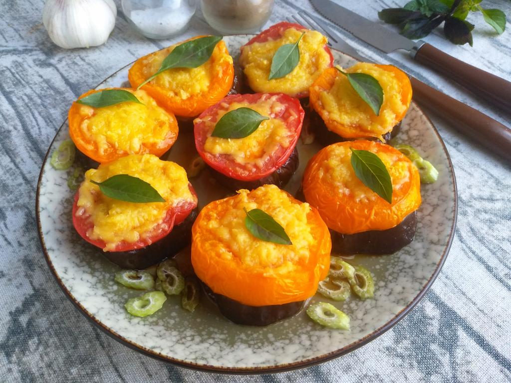 Помидоры посыпать подготовленной сырно-чесночной смесью. Запекать кружочки баклажана с помидорами под сыром при температуре 190 градусов до расплавления сыра (около 15 минут).