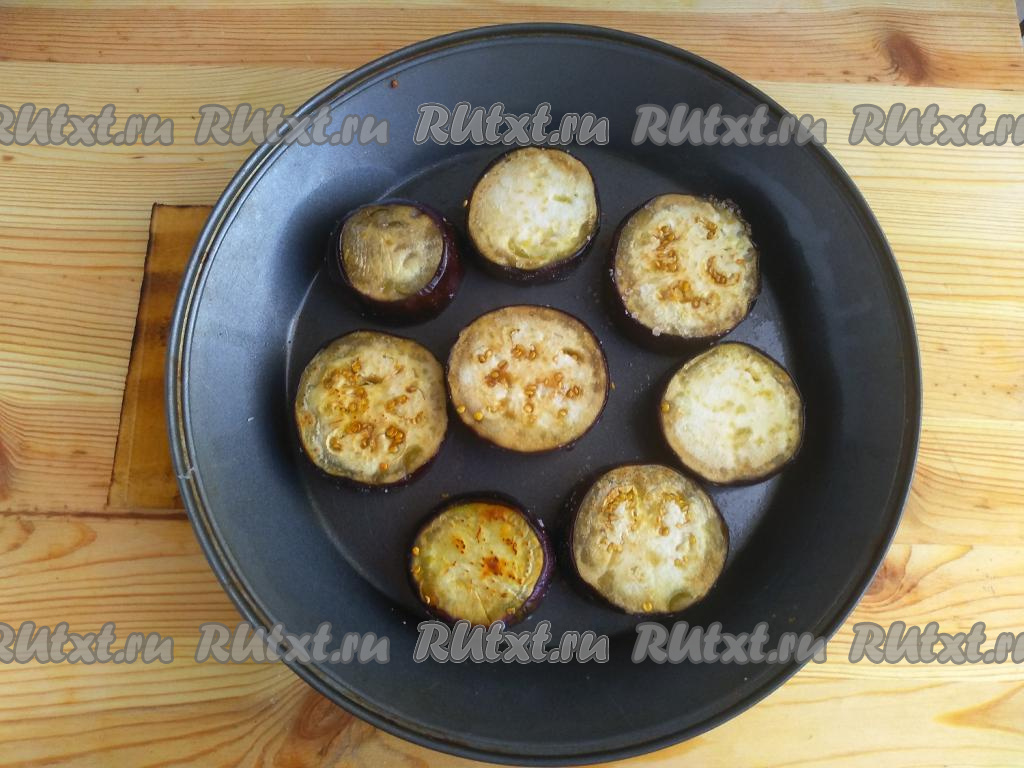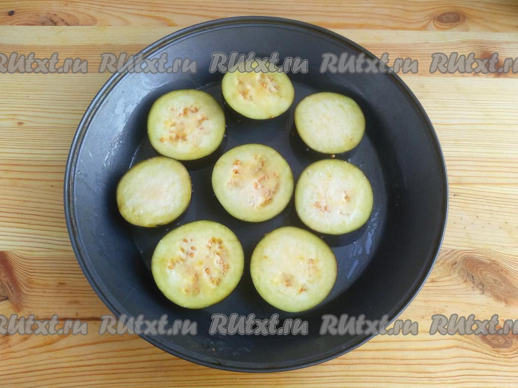 По истечении времени, смазать растительным маслом форму для запекания, выложить кружочки баклажана, отправить в разогретую духовку и запекать 10 минут при температуре 190 градусов.