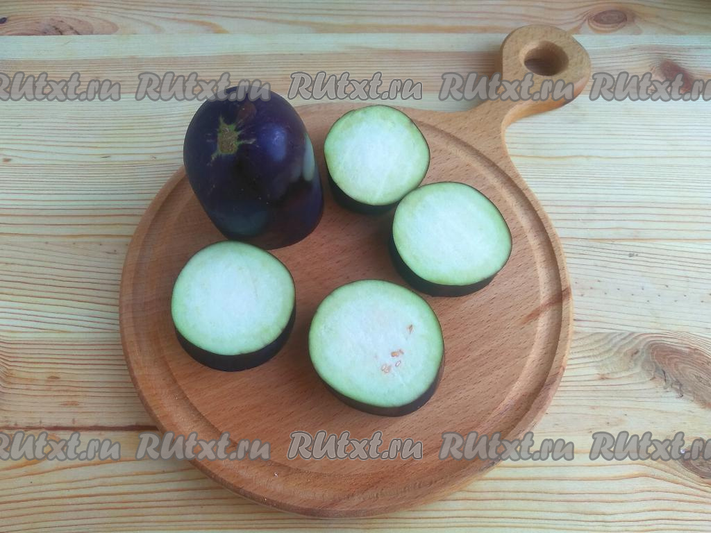 Промыть баклажан в проточной воде, отрезать хвостик. Нарезать овощ кружочками толщиной 1 см.