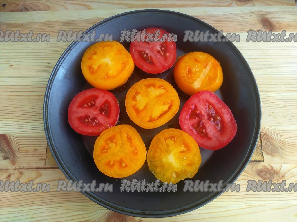 Помидоры (я взяла красный и жёлтый помидорчики) нарезать кружочками толщиной 0,5-0,7 см.