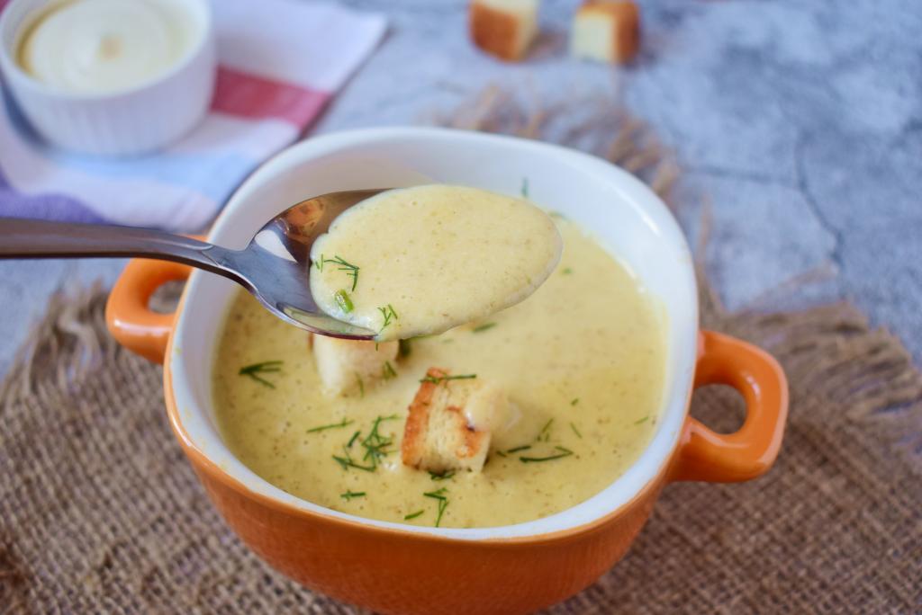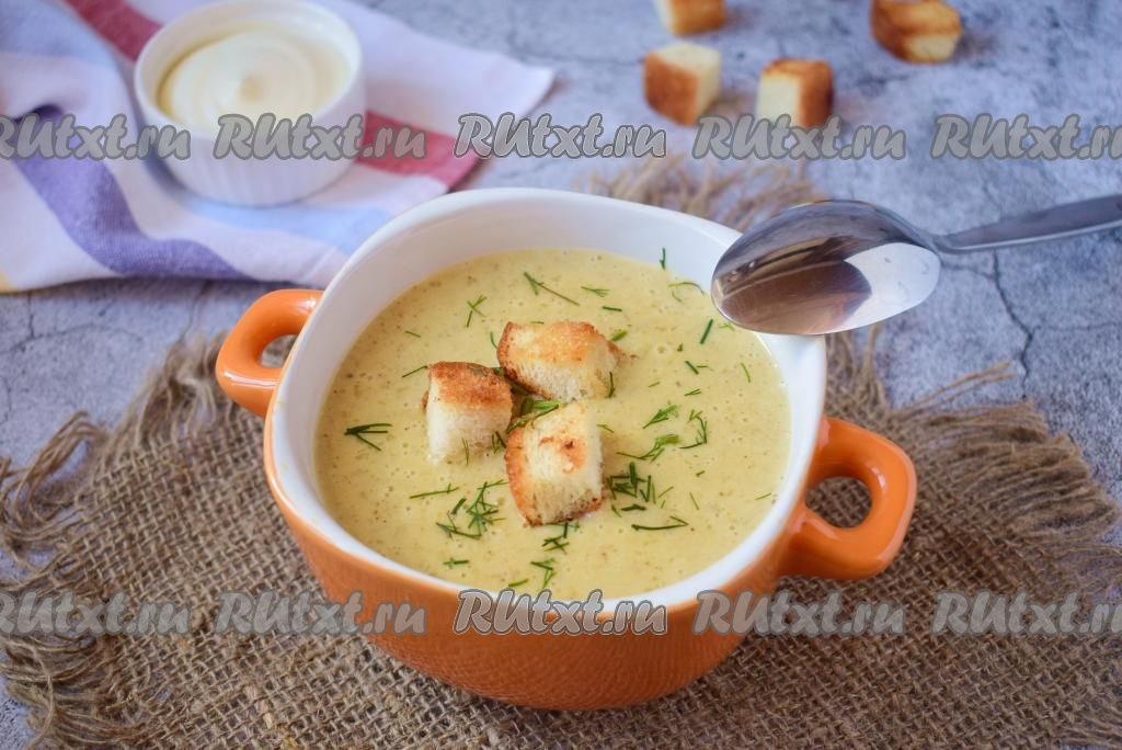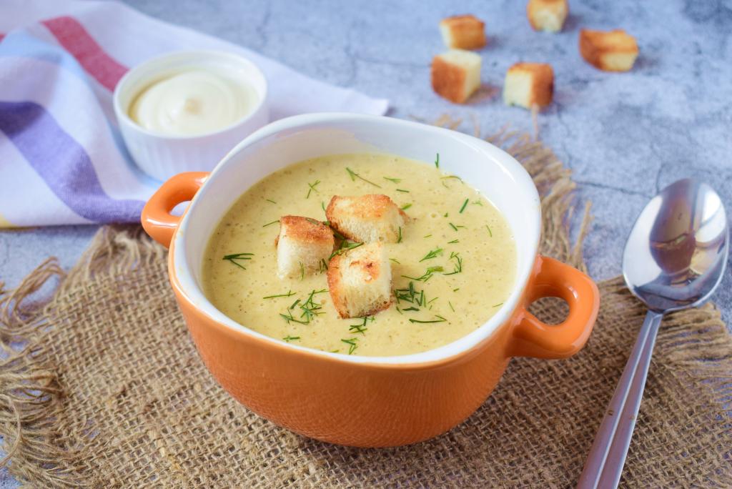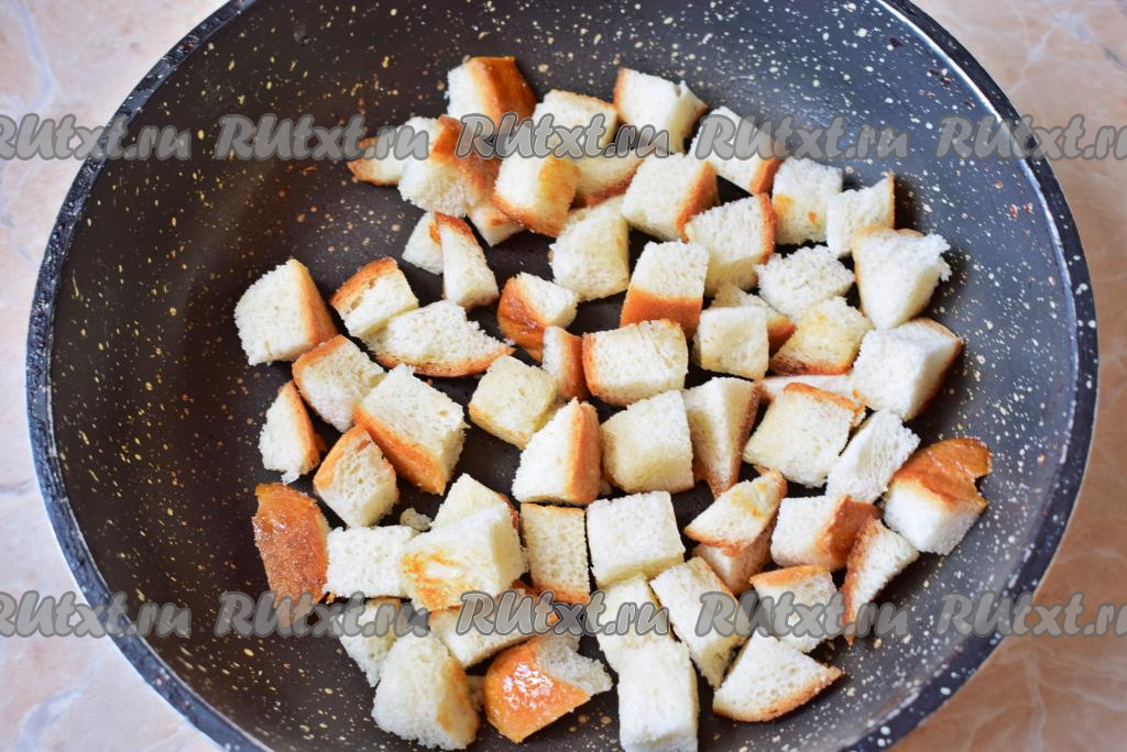 К такому супу-пюре отлично подойдут сухарики из батона. Просто подсушите нарезанные кубики батона, немного их подсолив, на сухой сковороде на среднем огне до золотистой корочки со всех сторон.