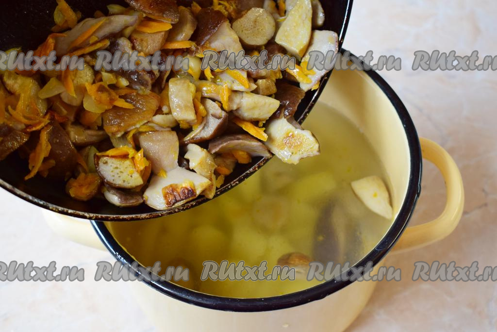 Готовую зажарку с белыми грибами переложите в кастрюлю к картофелю и варите суп минут 15. По вкусу добавьте немного соли и специи. Слишком ароматные специи добавлять не стоит, чтобы не перебивать естественный аромат лесных грибов.