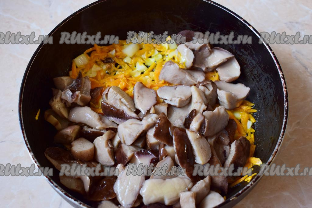 Для приготовления зажарки разогрейте небольшую сковороду до горячего состояния и налейте немного растительного масла. Выложите подготовленные морковку и лук, обжаривайте их на среднем огне минут 5, периодически помешивая. Затем добавьте в сковороду к зажарке отварные лесные грибы, перемешайте и обжаривайте ещё 3-5 минут, помешивая время от времени.