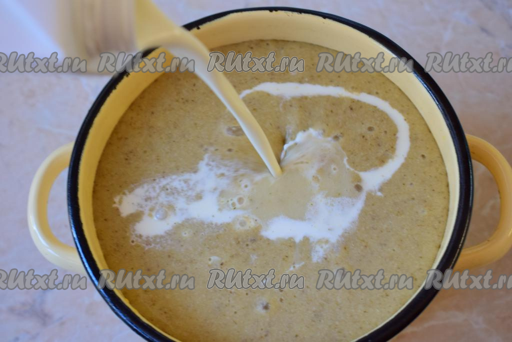 Однородный суп-пюре перелейте обратно в кастрюлю и добавьте в него сливки. Рекомендую использовать сливки более жирные, чтобы вкус супа был более сливочным. Доведите суп-пюре из белых грибов до кипения и снимите с огня. Если необходимо, густоту супа можно отрегулировать бульоном, оставленным ранее.