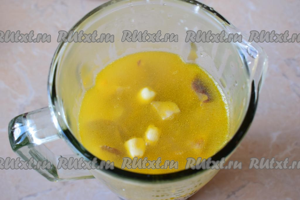 Затем перелейте готовый суп в стационарный блендер (немного бульона от супа оставьте, чтобы потом была возможность отрегулировать густоту готового супа), добавьте очищенные зубчики чеснока, измельчите до однородной консистенции.