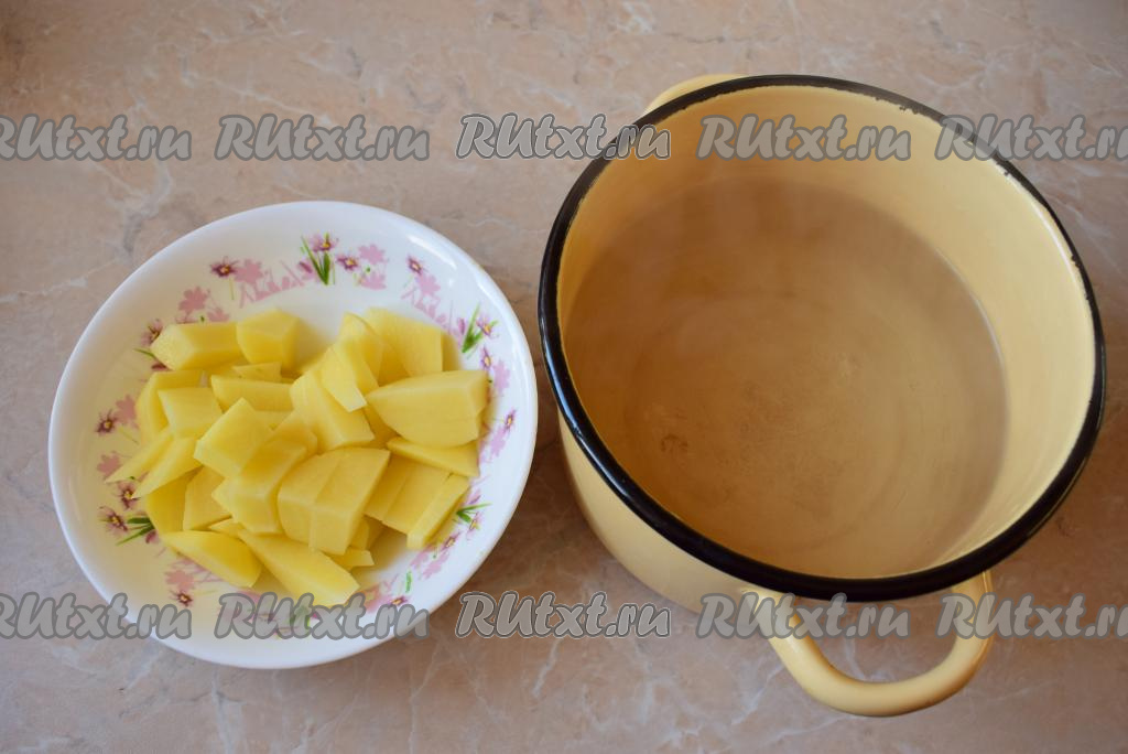 Белые грибы нужно очистить, промыть, крупные грибочки разрезать на части и выложить в кастрюлю с водой, варить минут 20-25 с момента закипания, затем воду необходимо слить. Грибной суп по этому рецепту можно готовить на бульоне (мясном или овощном) или на воде. Налейте воду (или бульон) в небольшую кастрюлю, поставьте на огонь и доведите до кипения. В это время очистите картофель и нарежьте его на кусочки. Затем выложите картофель в кипящую жидкость, снова дайте закипеть и оставьте вариться минут на 10 на небольшом огне.