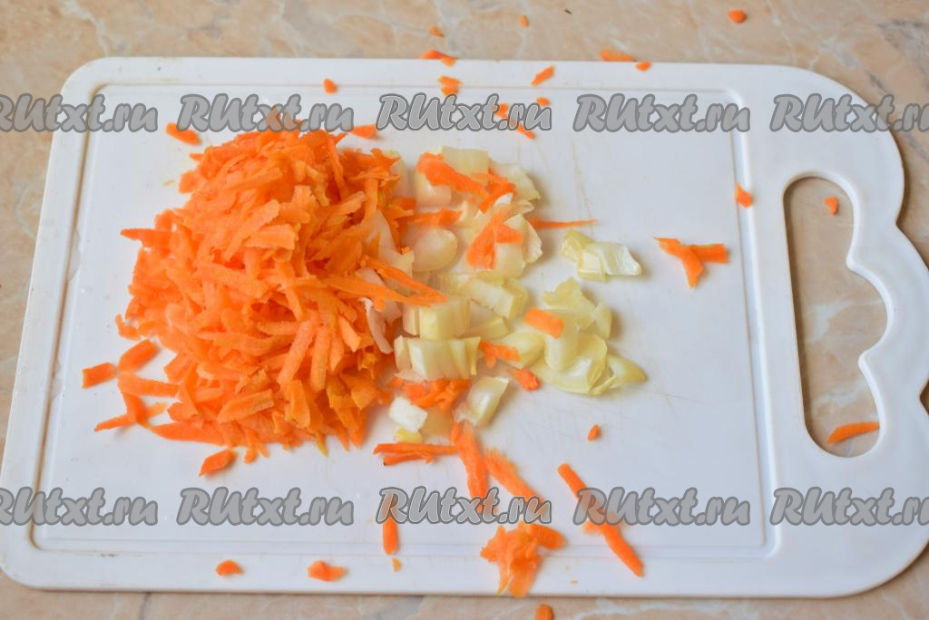 Лук и морковь очистите от кожуры и ополосните. Морковь натрите на тёрке (или мелко нарежьте). Лук тоже нужно нарезать некрупно. Размер измельчения овощей в данном случае значения не имеет, так как потом суп будет измельчаться блендером.