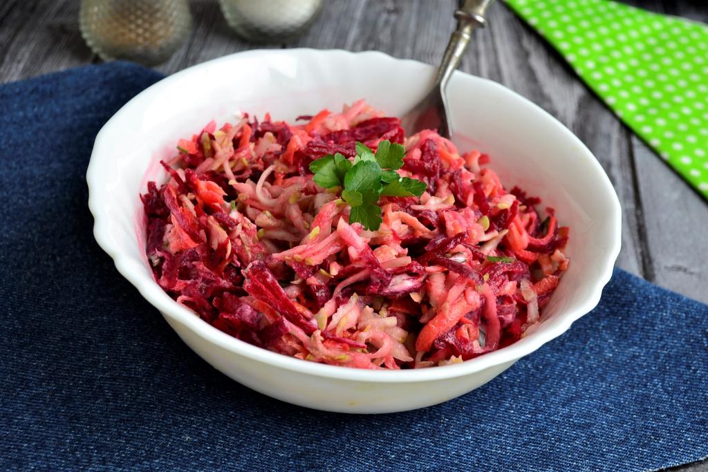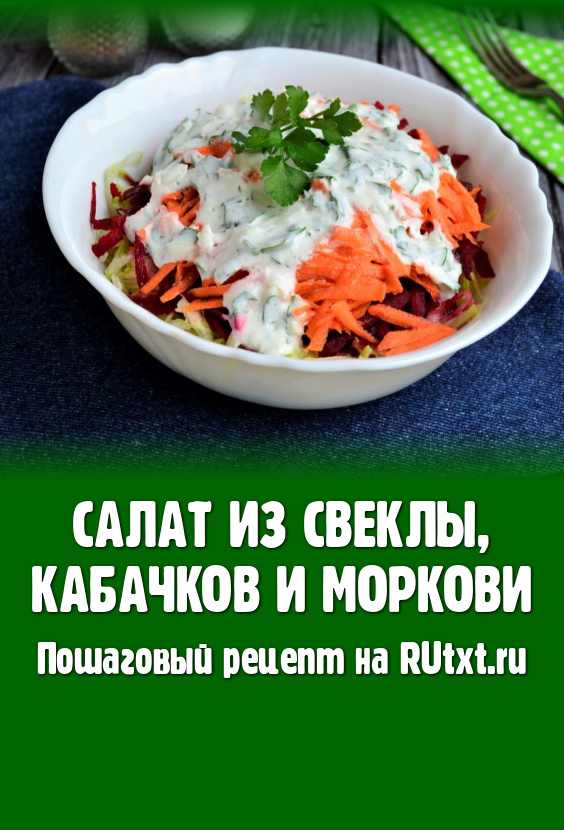 Полезный и очень вкусный салат, приготовленный из свеклы, кабачков и моркови, не перемешивая, сразу подать к столу.