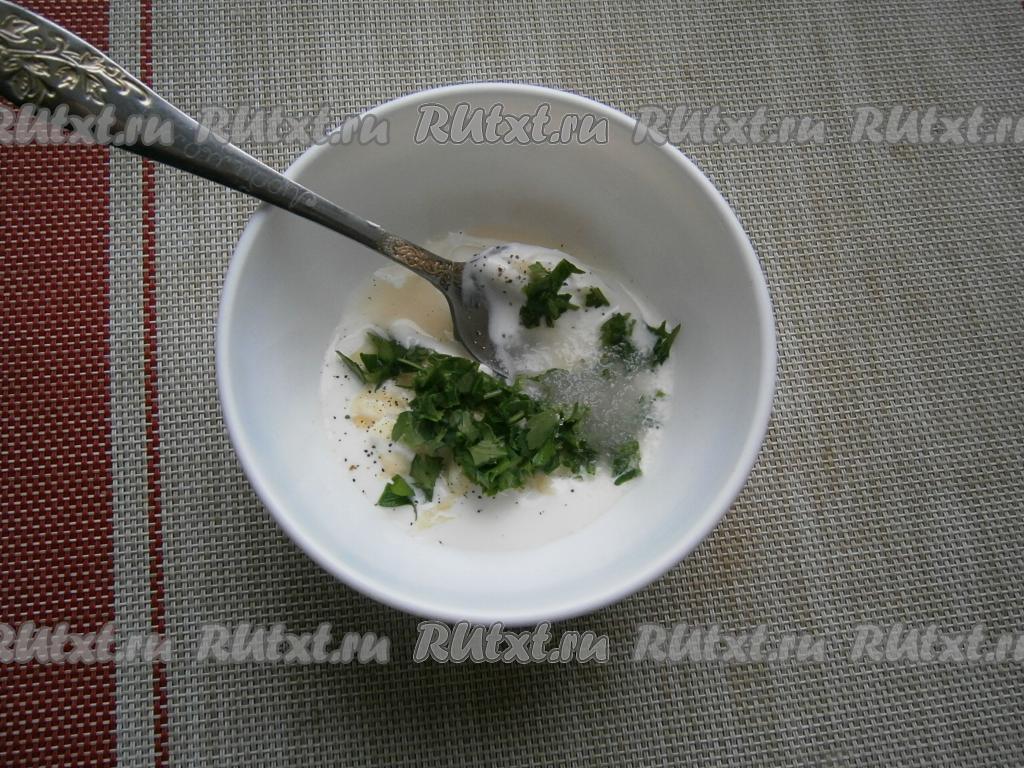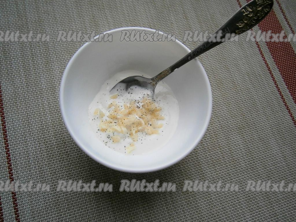 Сметану (или йогурт) выложить в пиалу, добавить измельчённый чеснок, чуть соли и чёрный молотый перец.