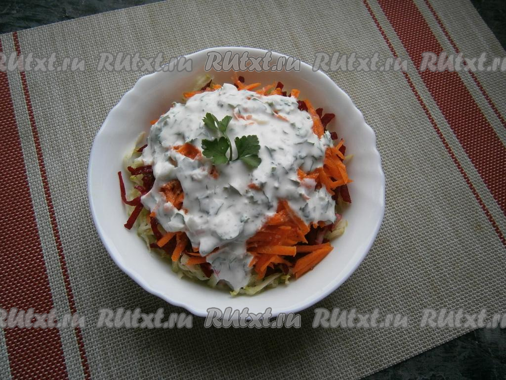Салат из свежих морковки, кабачка и свеклы полить сверху подготовленной заправкой.