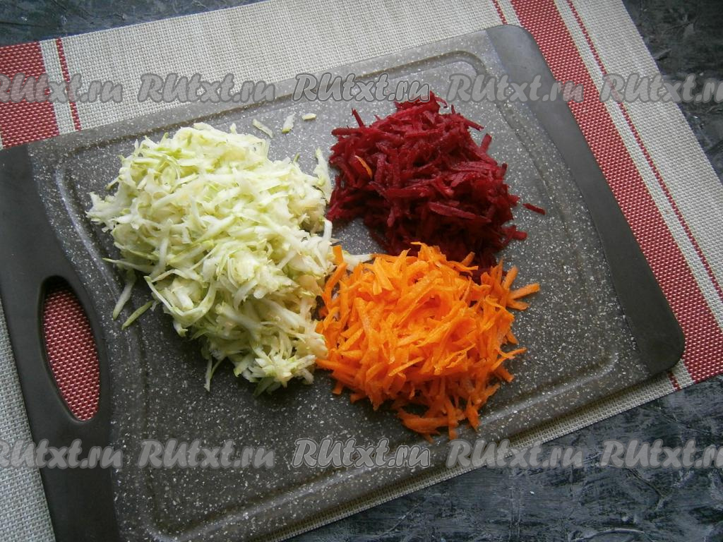 Сырые свеклу и морковь очистить, вымыть. На крупной тёрке поочерёдно натереть кабачок, морковь и свеклу. Смешивать натёртые овощи не нужно, так как салат будет выкладываться слоями.