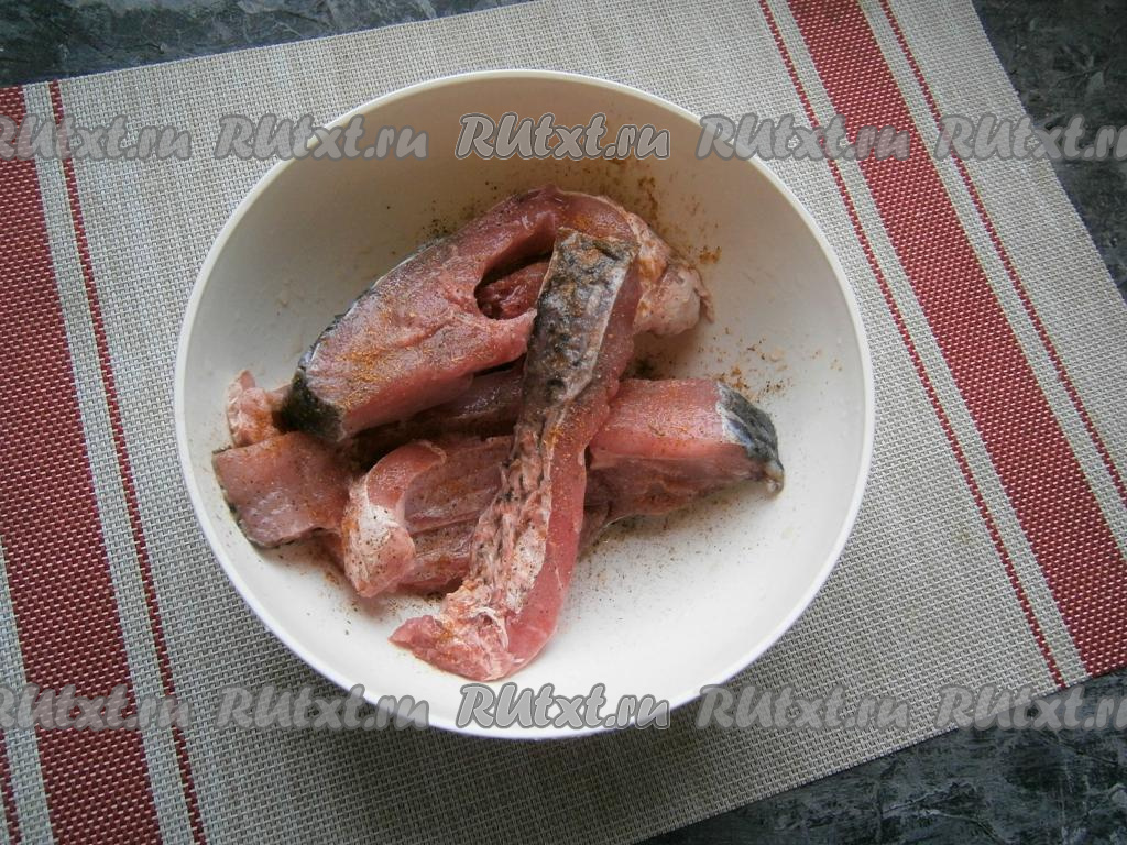 Карпа очистить от чешуи, удалить внутренности, промыть, а затем нарезать на порционные кусочки. Рыбку посолить, посыпать чёрным молотым перцем и приправой для рыбы.