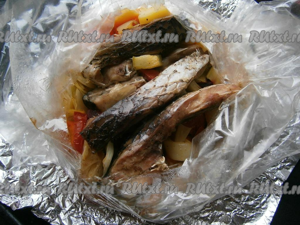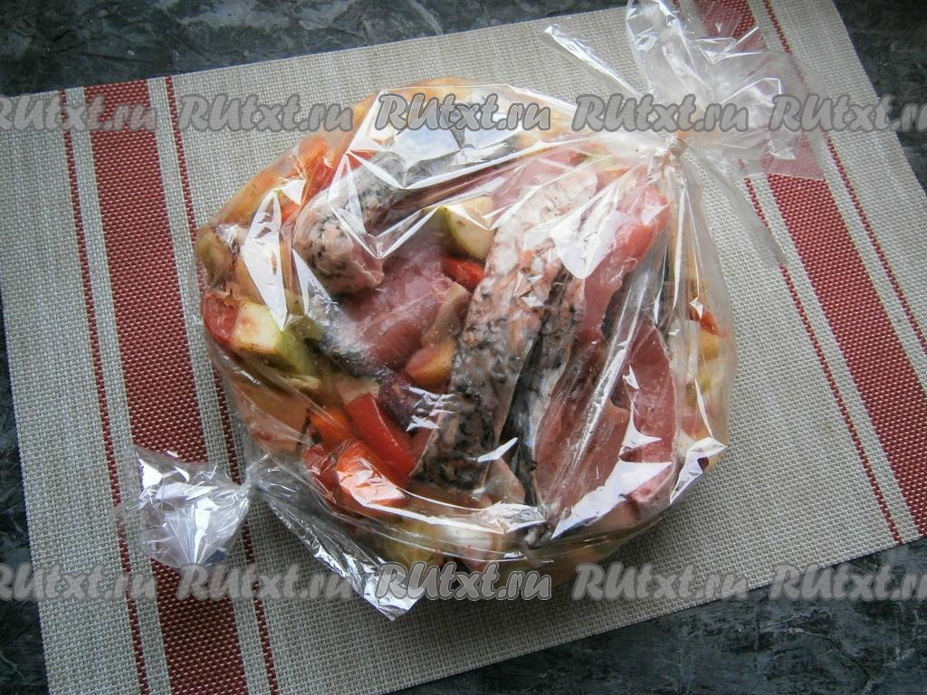 Все овощи выложить в рукав для запекания, сверху разместить кусочки карпа. Концы рукава крепко зафиксировать с двух сторон, а вверху пакета сделать несколько проколов зубочисткой.