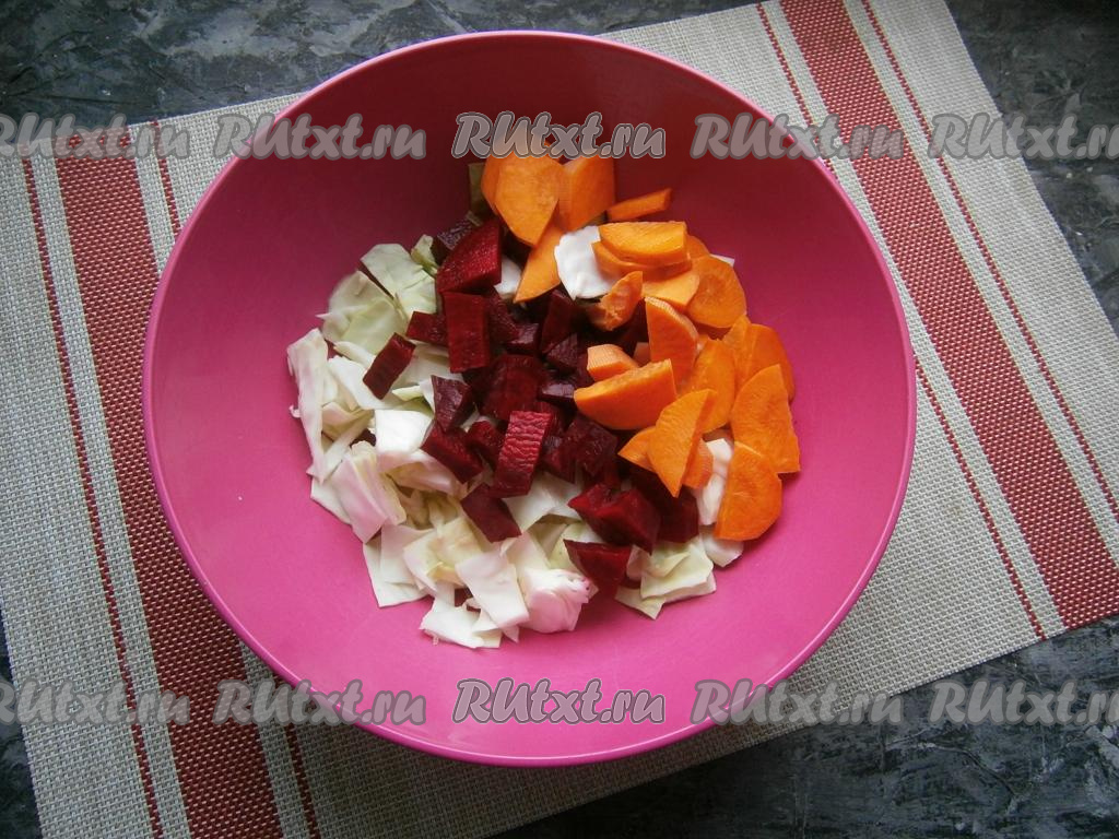 Свеклу, луковицу, морковь, картошку очистить. Удалить плодоножку с семенами из болгарского перца. Если у кабачка кожура жёсткая, её нужно срезать, крупные семечки тоже нужно удалить. Белокочанную капусту нарезать в большую миску "шашечками", добавить свеклу, нарезанную средними кубиками, и морковь, нарезанную на произвольные кусочки.