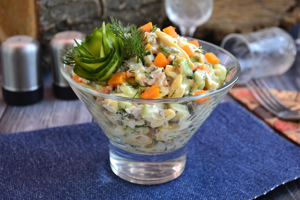 Салат с консервированным тунцом, сыром, морковью, огурцами и яйцом посолить и поперчить по вкусу, добавить майонез (или сметану).