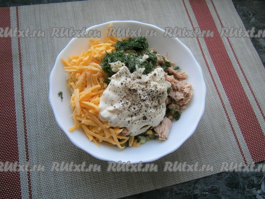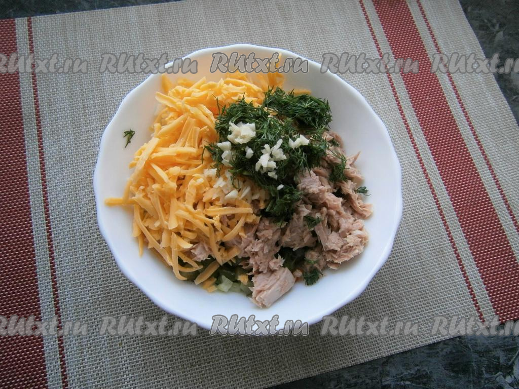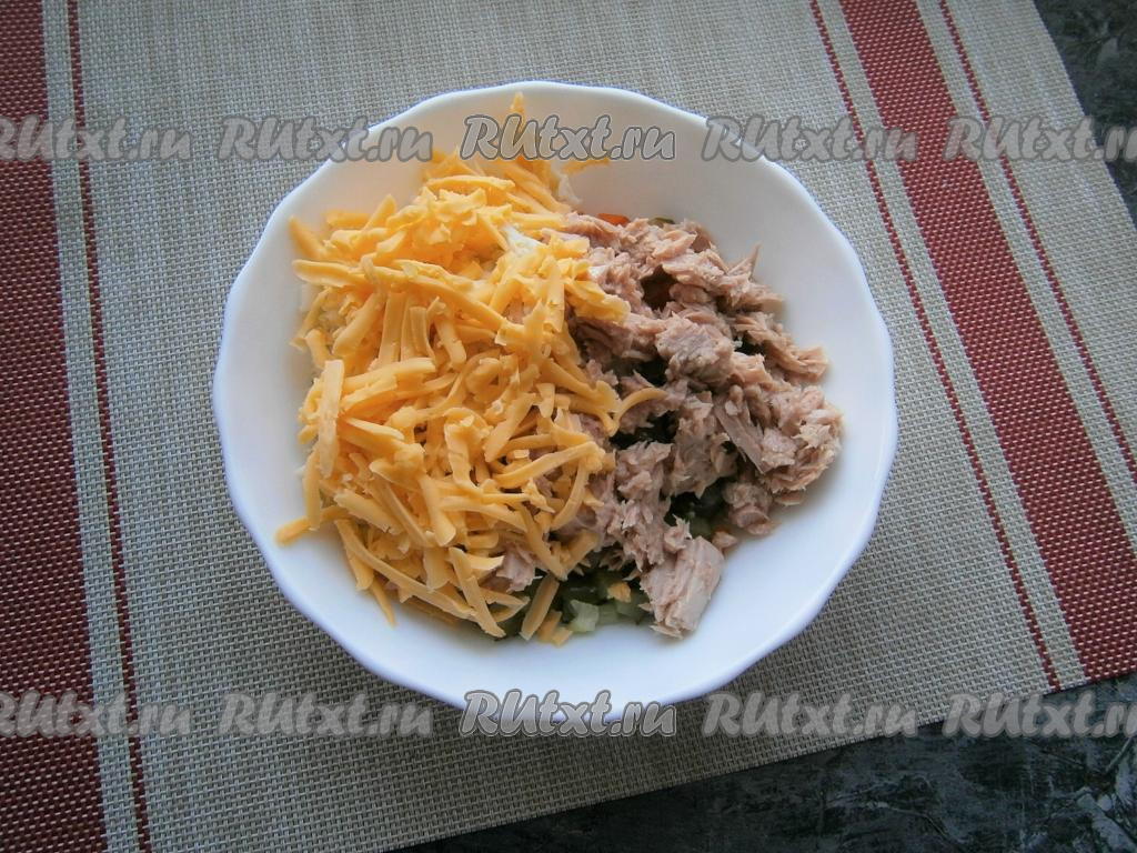 Сыр натереть на крупной тёрке и добавить к остальным ингредиентам вместе с тунцом.