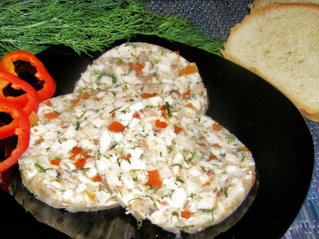 Вливаем горячий желатиновый раствор в смесь куриного мяса с перцем и укропом, перемешиваем.
