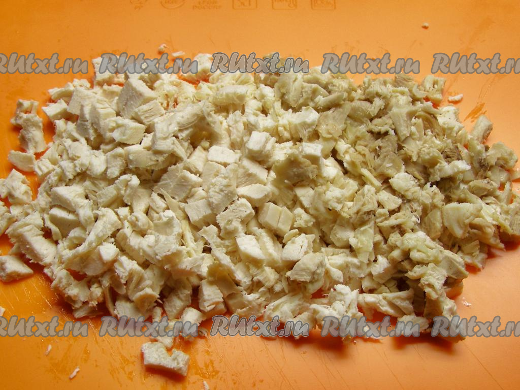 Варёную курицу достаём из бульона, оставляем немного остыть, затем отделяем от кожи и косточек. Куриное мясо мелко нарезаем.