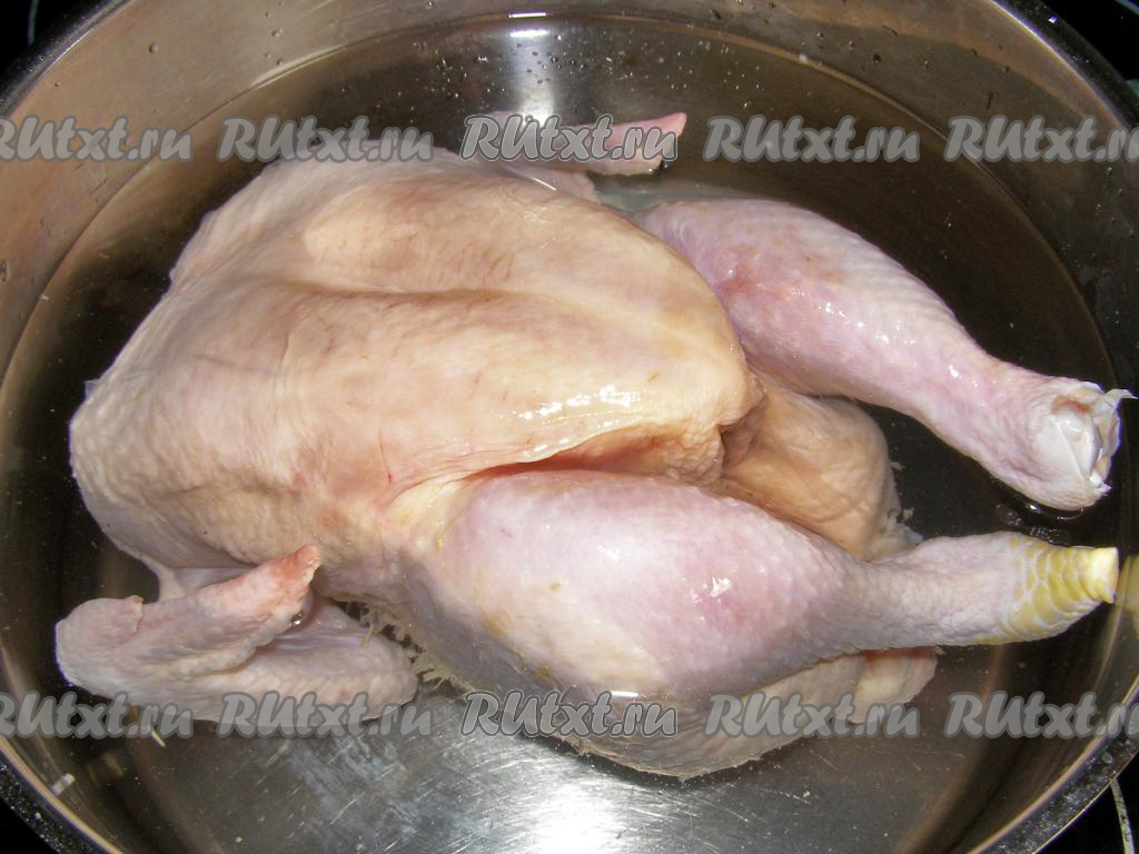 Курицу моем, выкладываем в кастрюлю и заливаем холодной водой, добавляем соль (я добавила 3 чайные ложки) и ставим кастрюлю на сильный огонь. Доводим до кипения и убавляем огонь до среднего. Варим до готовности (минут 50), периодически снимаем с бульона пену. В сотейник отливаем 200 мл бульона, процеживаем и оставляем остывать. Бульон, оставшийся в кастрюле, можно в дальнейшем использовать для приготовления супа.