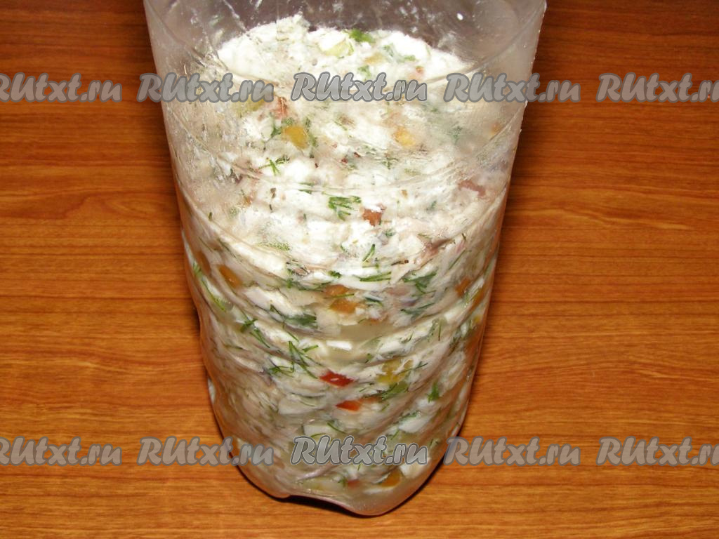 Перекладываем в бутылку куриную смесь, слегка прижимаем ложкой, чтобы не было пустых мест. Верх бутылки прикрываем пищевой плёнкой и убираем в холодильник минимум на 7 часов.
